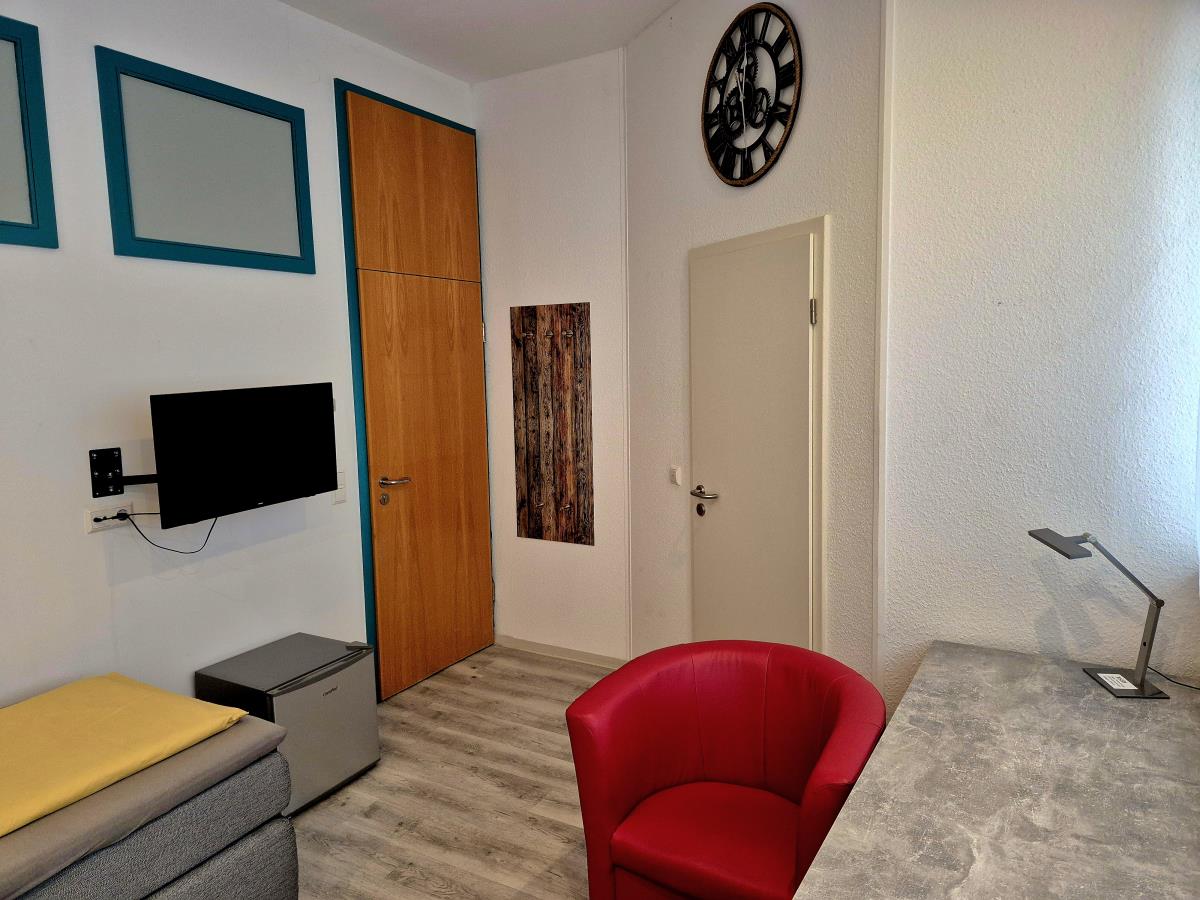 Das Apartment ist mit einem komfortablen Boxspringbett (80x200 cm, Härtegrad H3), einem praktischen Schwebetürenschrank mit integriertem Safe sowie einem modernen Eckschreibtisch ausgestattet. Zur weiteren Ausstattung gehören ein Minikühlschrank, ein Smart TV und kostenfreies WLAN.